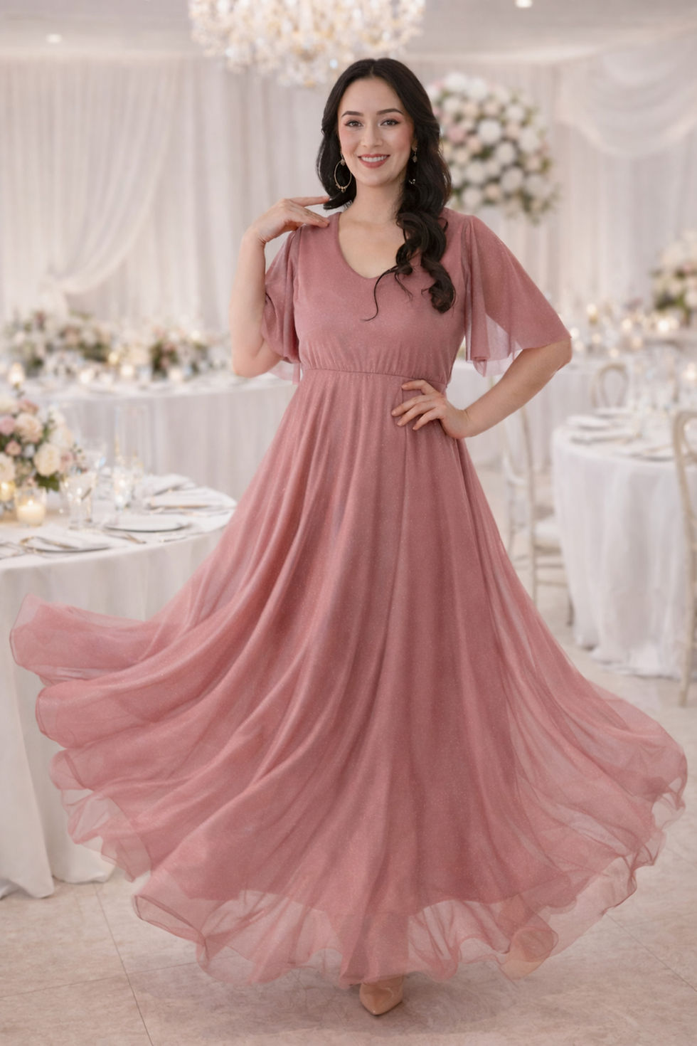 V Yaka Volan Kol Simli Tül Detaylı Modern Kesim Şık Kırmızı Abiye Elbise 3062